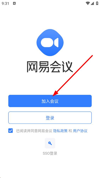 1、進入界面后看到網易會議標識,下方有加入會議和登錄按鈕,還需勾選已閱讀并同意相關協議,可根據需求選擇加入會議或登錄的操作。
