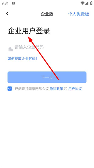 3、選擇登錄后若切換到企業版,進入企業用戶登錄界面,需填寫企業代碼,頁面還有如何獲取企業代碼的提示,填寫后可點擊下一步。