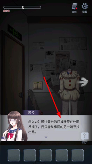 2、發現通往天臺的門不知被誰反鎖,角色從房間另一端尋找出路,推進解謎進程。