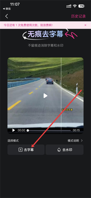 2、無痕去字幕界面中,選擇去字幕模式,可對目標視頻執行字幕清除操作,界面同步顯示當日剩余使用次數的提示信息。
