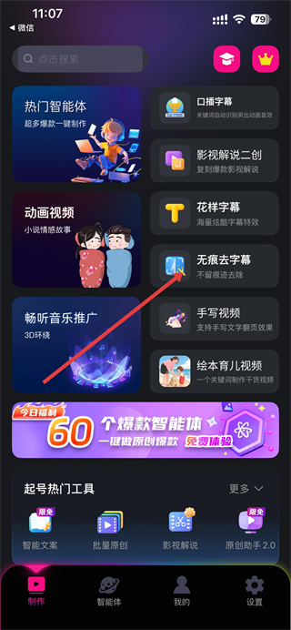 1、進入短視頻工具的制作界面,找到無痕去字幕功能選項并點擊,進入該功能的操作界面,此功能可實現無痕跡清除視頻字幕與水印。