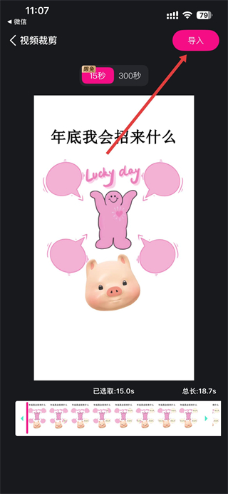 3、完成字幕處理后,進入視頻裁剪界面,可選擇裁剪時長如15秒,點擊導入按鈕添加需要裁剪的視頻素材進行編輯。