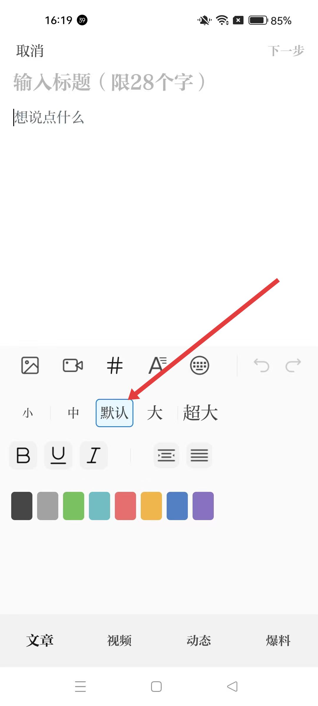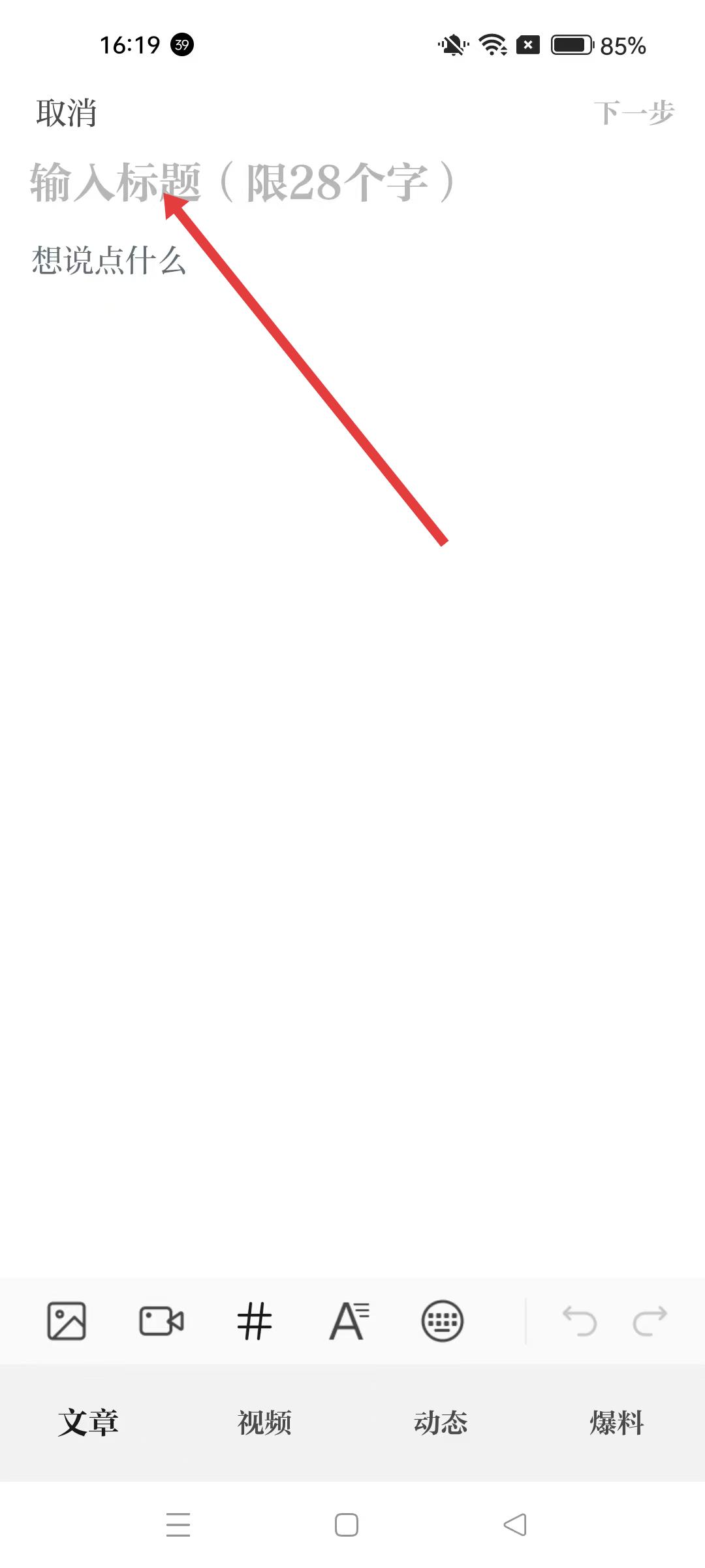 2、內容發布界面,可輸入標題,下方可輸入內容,還有添加圖片、視頻等功能選項,可選擇發布文章、視頻、動態、爆料等類型。