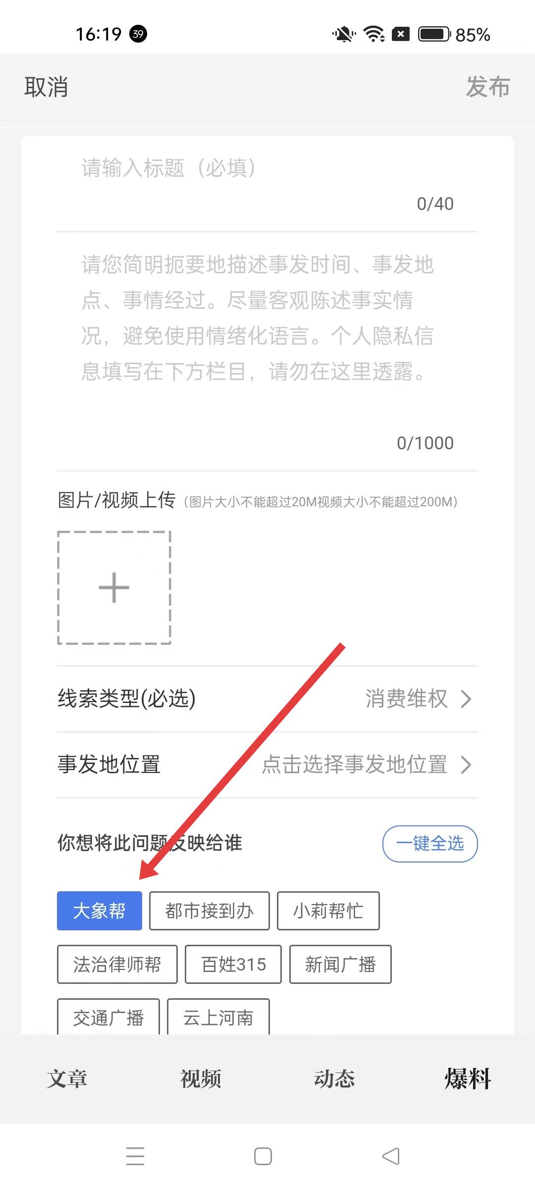 4、若選擇爆料類型,需填寫標題、事件描述,上傳圖片或視頻,選擇線索類型、事發地位置及反映對象,填寫完成后可點擊發布。