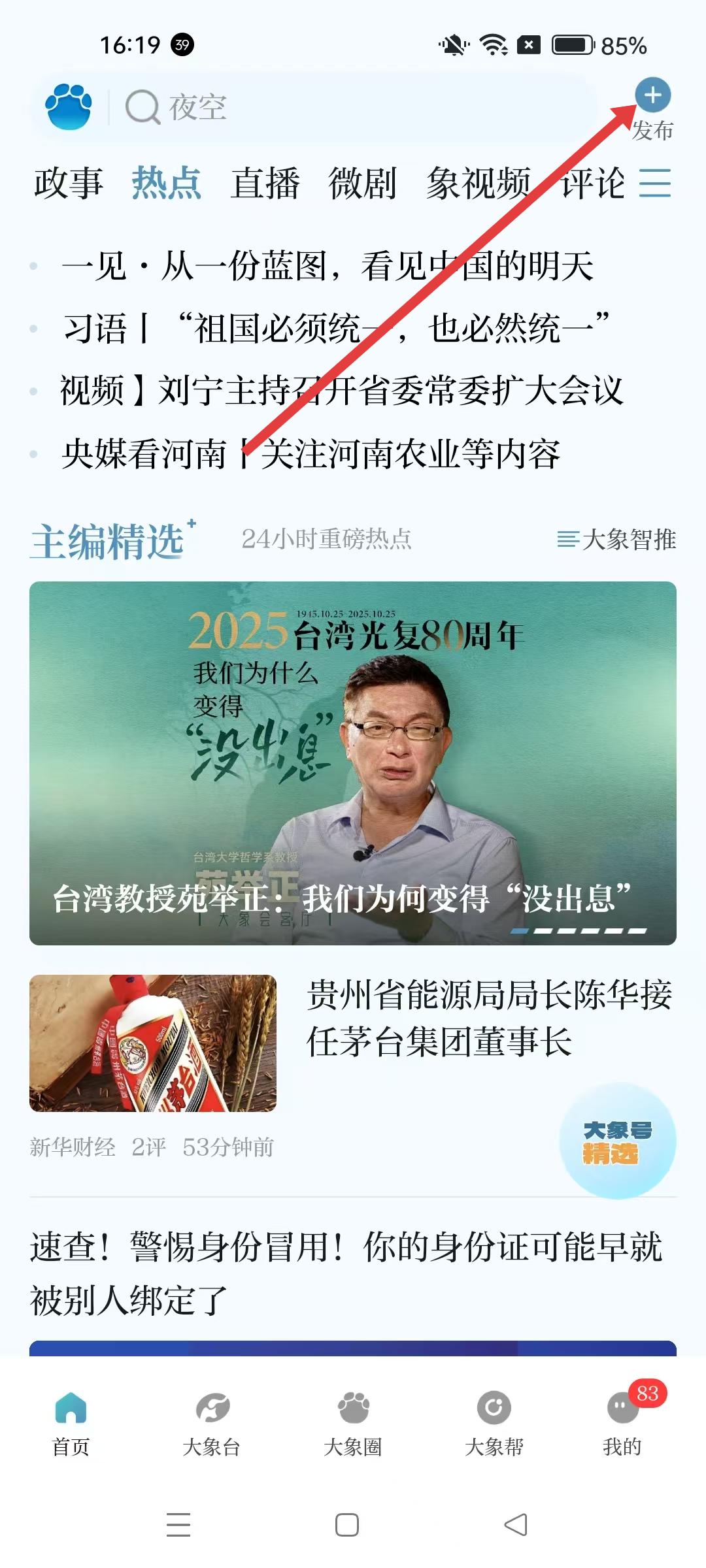 1、進入大象新聞APP首頁,頂部有搜索欄可搜索內容,下方有政事、熱點等板塊展示新聞資訊,點擊右上角發布可進入內容發布界面。