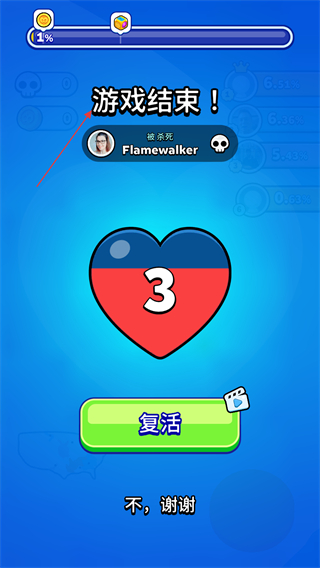 4、如果被其他玩家消滅,游戲會結束并顯示相關信息,此時可以選擇復活按鈕重新開始游戲。