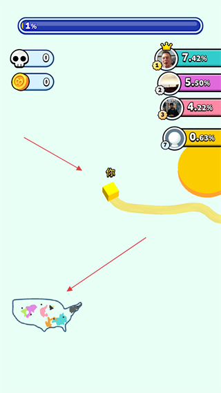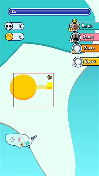 2、進入游戲后操控代表自己的小方塊,拖動它在地圖上移動拉出一條路徑,路徑覆蓋的區域會變成自己的領地。
