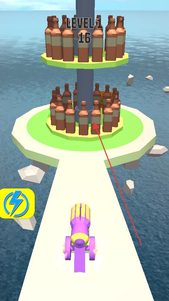 3、持續射擊瓶子,每擊中一批瓶子,關卡上方分數會增加,還可能出現閃電等增益道具,拾取后能增強射擊能力,更高效地清理瓶子。