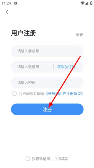 4、進入用戶注冊頁面,輸入手機號并獲取驗證碼,填寫收到的內容與設置密碼,勾選協議后點擊注冊,完成賬號注冊操作。