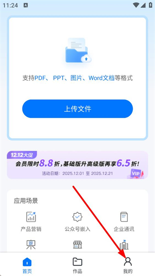 1、進入云展網首頁可上傳PDF、PPT等格式文件,頁面顯示會員促銷活動,還有產品營銷等應用場景選項,點擊底部我的可進入個人頁面。