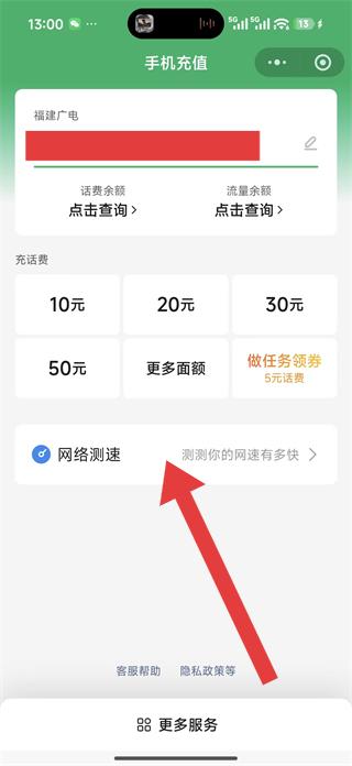 2、在手機充值界面,找到網絡測速選項,點擊進入網絡測速的相關操作頁面。
