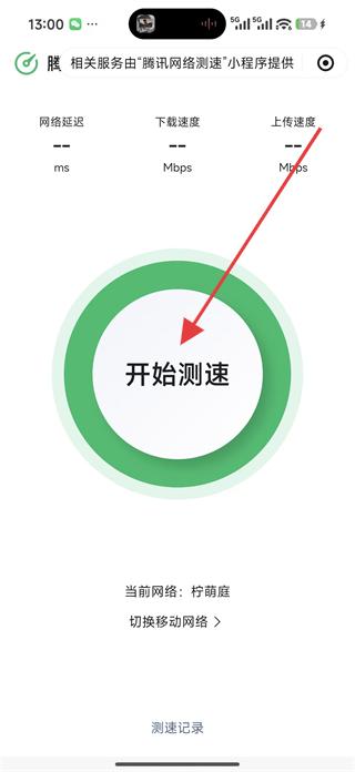 4、在騰訊網絡測速小程序頁面,點擊開始測速,進行網絡延遲、下載速度、上傳速度的檢測。