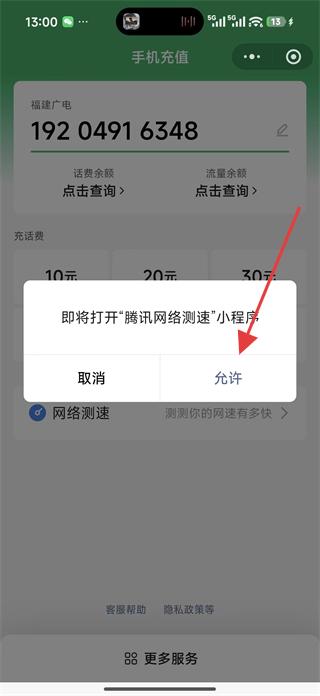3、在彈出的即將打開騰訊網絡測速小程序提示框中點擊允許,進入騰訊網絡測速小程序。