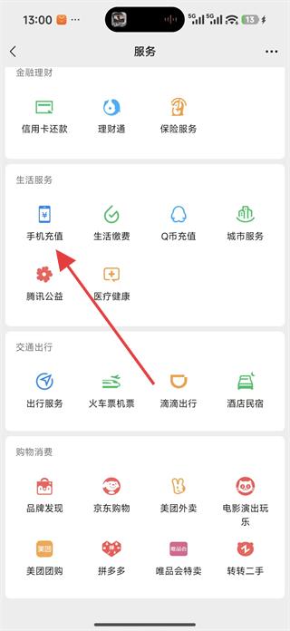 1、進入微信服務頁面,找到生活服務板塊中的手機充值選項并點擊,進入手機充值界面。