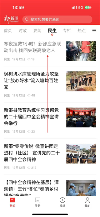 2、登錄后進入主界面選擇民生等板塊,瀏覽展示的資訊列表,挑選感興趣的資訊標題,點擊該標題,進入對應的資訊詳情頁面查看內容。