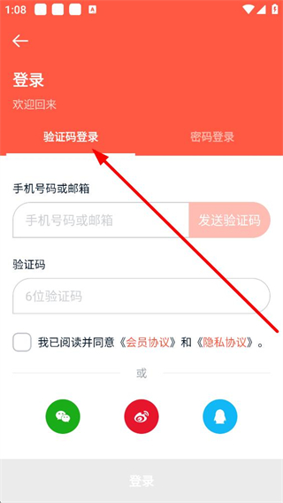 2、登錄時可選擇驗證碼登錄方式,輸入手機號碼或郵箱,獲取并輸入6位驗證碼,勾選同意協議后即可登錄,也可選擇微信、微博、QQ等社交賬號登錄。