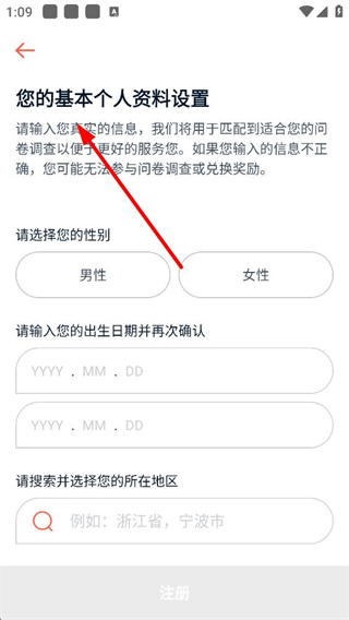4、注冊時需設置基本個人資料,選擇性別,輸入出生日期并確認,搜索選擇所在地區,完成后點擊注冊即可成為會員,參與問卷調查獲取積分。