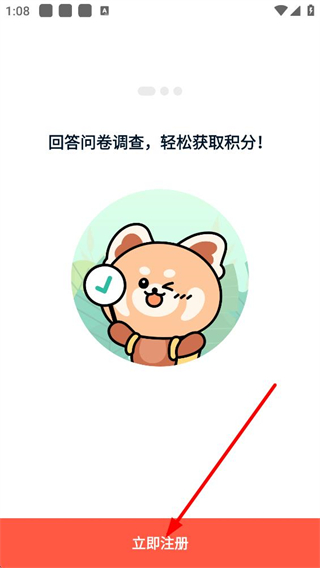 1、進入注冊界面,可看到回答問卷調查獲取積分的提示,點擊立即注冊開始注冊流程。