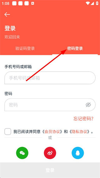 3、也可選擇密碼登錄方式,輸入手機號碼或郵箱和密碼,勾選同意協議后完成登錄,忘記密碼可點擊忘記密碼進行重置。