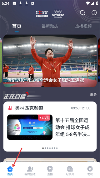 1、進入APP映入眼簾的是官方打造的專業界面,頂部CCTV奧林匹克頻道標識醒目,首頁、最新動態、熱播視頻標簽清晰,方便快速切換內容板塊。