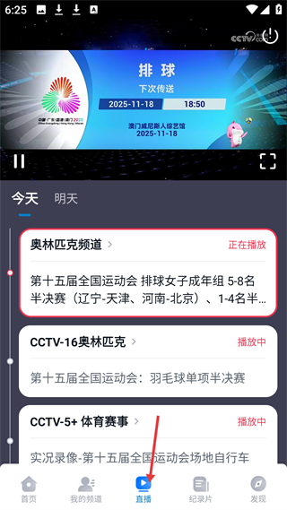 2、直播頁可觀看奧林匹克頻道、CCTV-16等多頻道直播,涵蓋排球、羽毛球、場地自行車等賽事,滿足用戶實時觀賽需求。