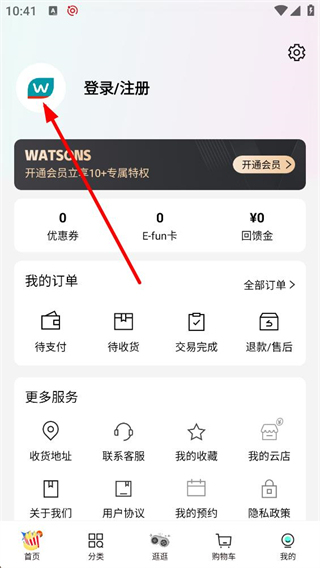 2、進入我的頁面,頂部顯示登錄、注冊入口,還能查看優惠券Efun卡等信息,設有我的訂單板塊及收貨地址等更多服務選項,可開展對應操作。