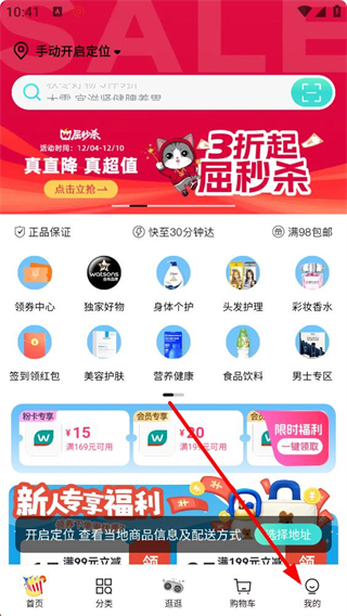 1、進入屈臣氏首頁,頂部設有搜索欄及屈秒殺活動入口,還有領券中心獨家好物等分類選項,底部導航欄包含首頁等按鈕,點擊我的即可進入對應頁面。