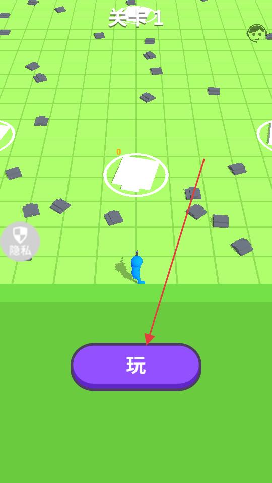 1、點擊玩按鈕進入關卡1,散布著灰色碎片和白色標記區域,操控藍色方塊人開始移動,準備爭奪場地。