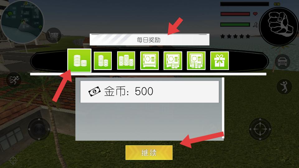 2、在每日獎勵界面,能領取金幣等獎勵,點擊繼續,進入游戲場景,可看到小地圖,利用虛擬按鍵控制角色移動,探索場景。
