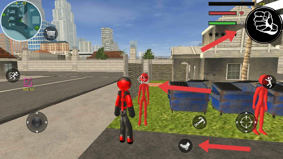 4、來到室外場景,查看角色的生命,經驗等狀態,操控角色攻擊其他火柴人,利用相關功能按鈕,完成游戲中的任務與挑戰。