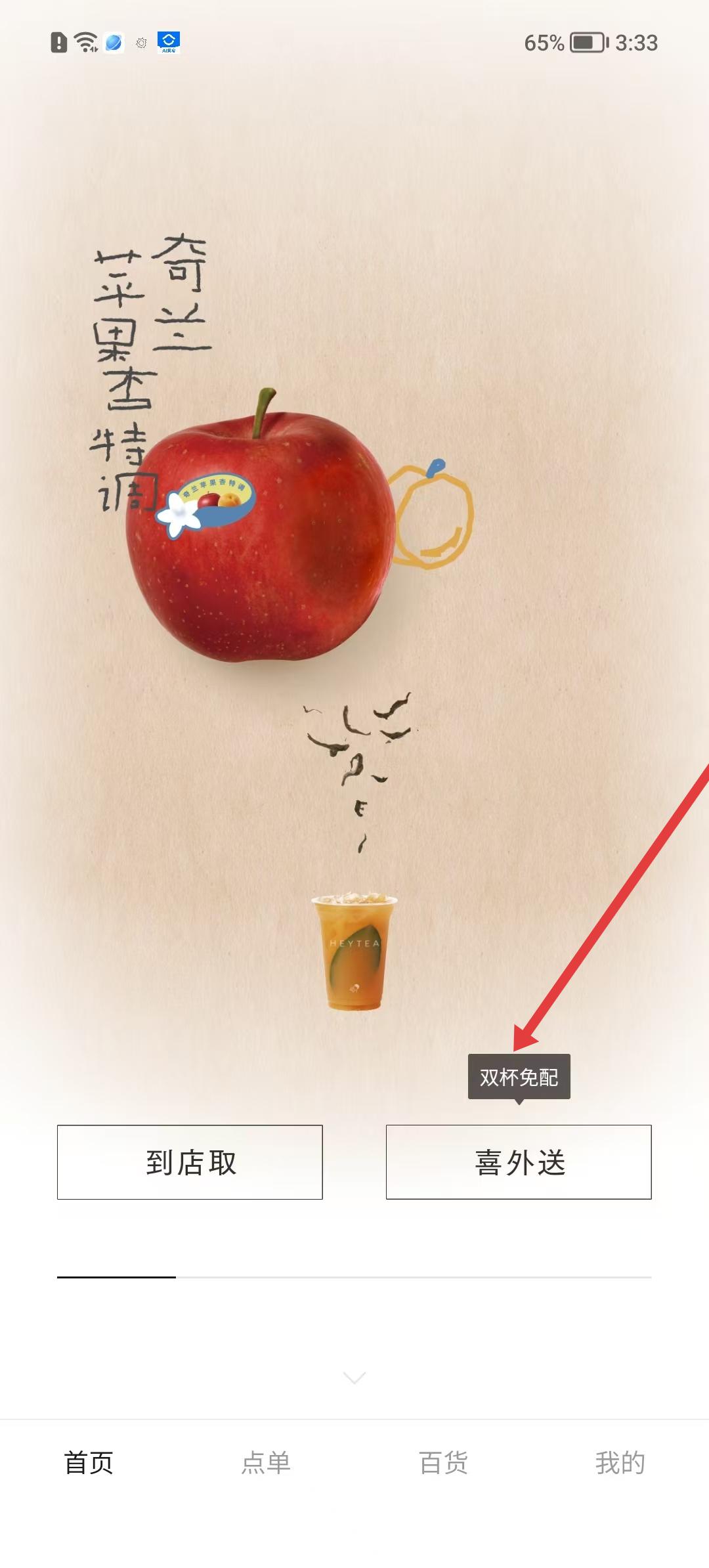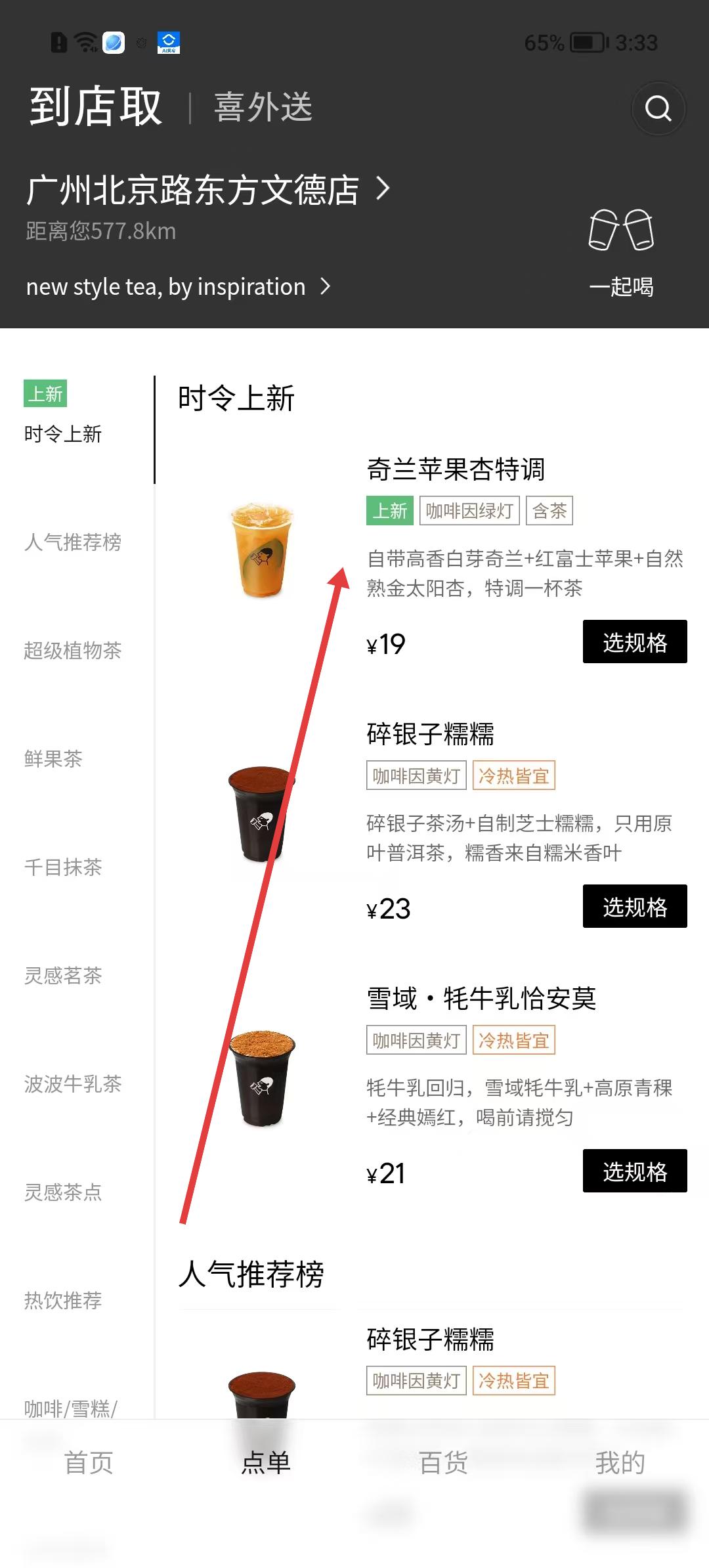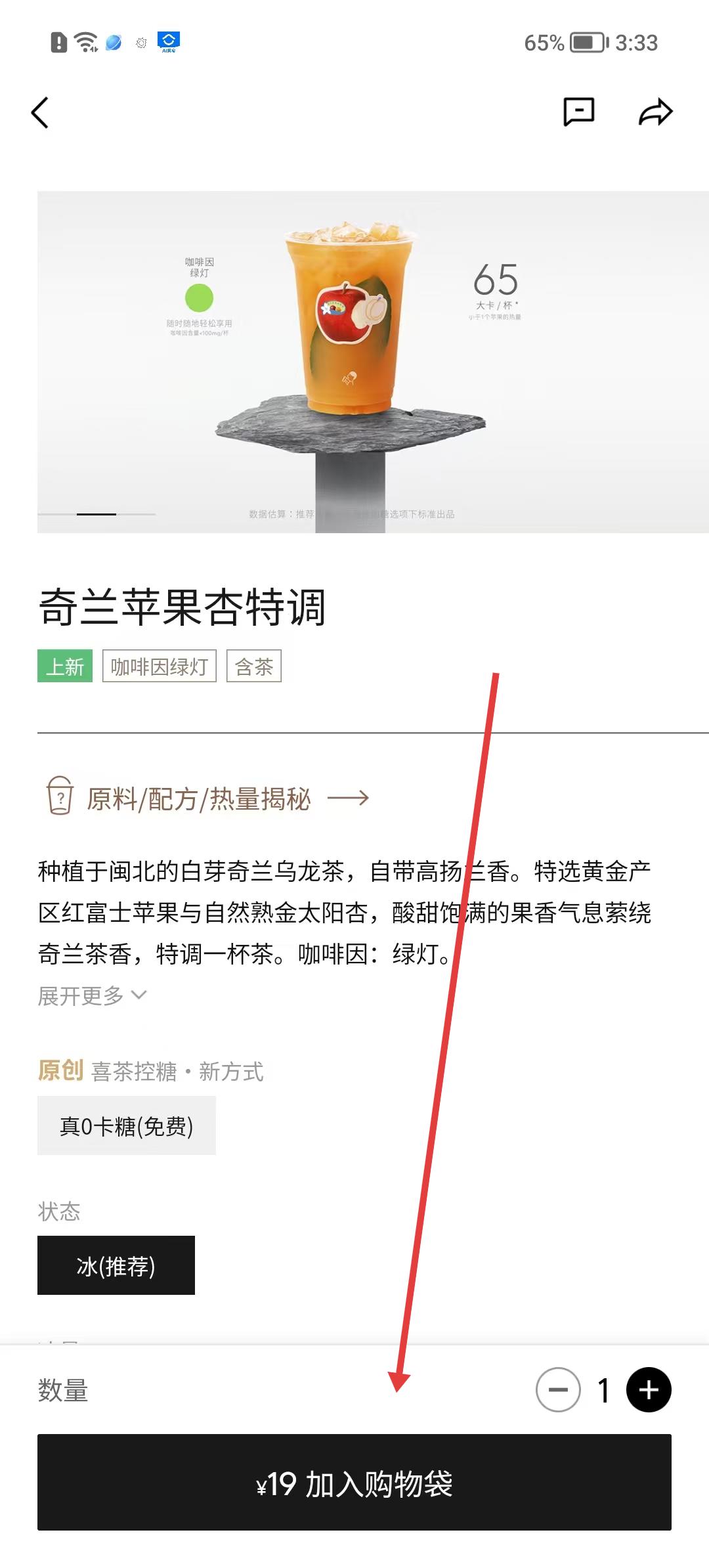 2、在點單頁面選擇時令上新的奇蘭蘋果杏特調,查看茶飲的原料和價格,進入規格選擇頁面。