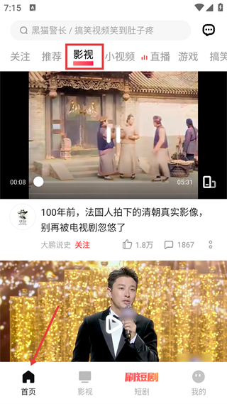1、首頁模塊,設影視短劇等分區,展示歷史影像類短視頻,支持播放互動,適配用戶碎片化的視頻瀏覽需求。