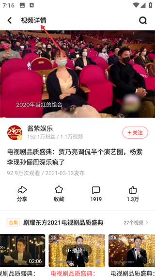 2、視頻詳情模塊,展示內容與創作者信息,支持分享收藏,關聯同類合集,助力用戶延伸觀看相關內容。