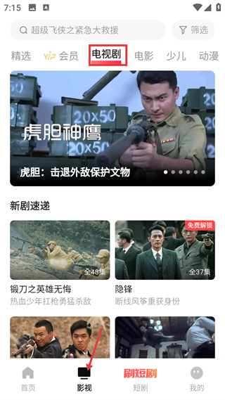 3、影視模塊,提供多品類篩選,展示新劇速遞,標注集數簡介,滿足用戶長視頻內容的查找需求。