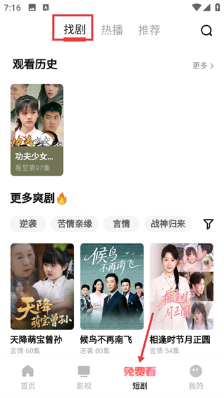 4、短劇模塊,含找劇熱播分區,展示觀看歷史與分類爽劇,支持題材篩選,適配豎屏短劇的消費偏好。