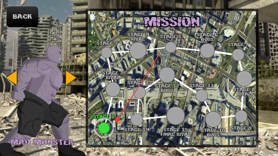2、來到關卡選擇界面,地圖上有多個標著數字的關卡節點,選擇標有STAGE1的,進入第一關的城市戰斗場景。
