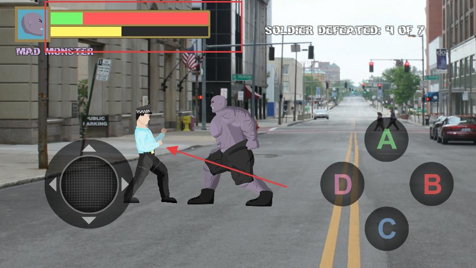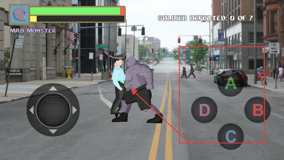 3、進入城市戰斗場景后,左側有搖桿可控制紫色怪物移動,右側有A、B、C、D四個攻擊按鈕,操控怪物靠近敵人,準備發起攻擊。