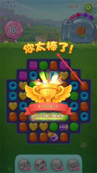 4、當成功完成關卡所有目標后,會顯示你太棒了的界面,還能獲得獎杯等獎勵,點擊任意位置可繼續游戲。