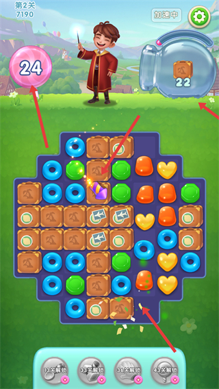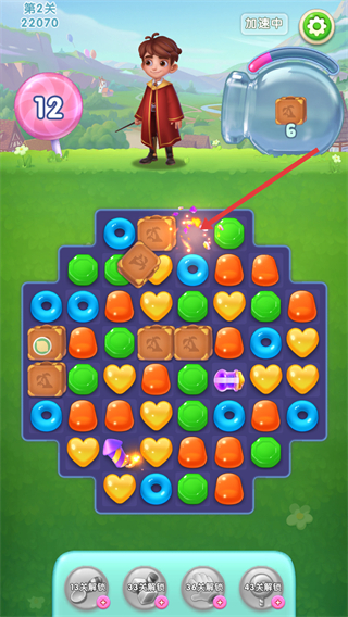 1、進入關卡后,可看到不同形狀和顏色的甜點,通過點擊等操作消除甜點,同時注意收集目標物品,推進關卡進度。