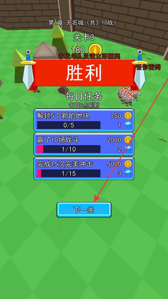 4、領取獎勵后界面顯示每日任務進度,包括解鎖地塊、贏取戰斗等任務,點擊下一關按鈕,繼續挑戰后續關卡,推進游戲進程。