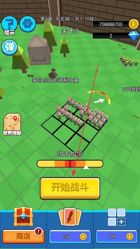 1、進入關卡3準備界面看到己方部隊排列整齊,下方有攻擊加倍進度條,點擊開始戰斗按鈕,讓部隊進入戰場,準備與敵人交戰。