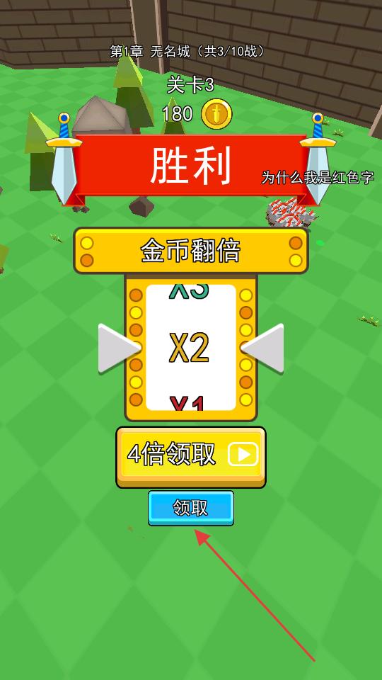 3、成功擊敗敵人后彈出勝利界面,界面有金幣翻倍領取選項,直接點擊領取按鈕,獲取當前關卡的金幣獎勵,積累資源用于后續強化。
