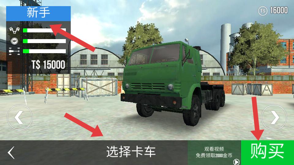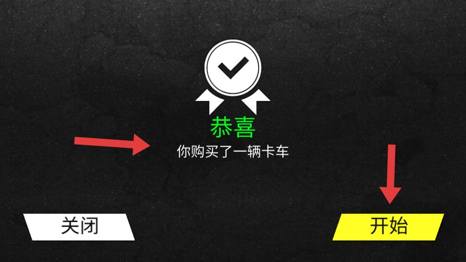 2、在卡車選擇界面,可看到新手等級的綠色卡車,有購買按鈕,點擊購買,成功后會顯示恭喜購買了一輛卡車的提示。