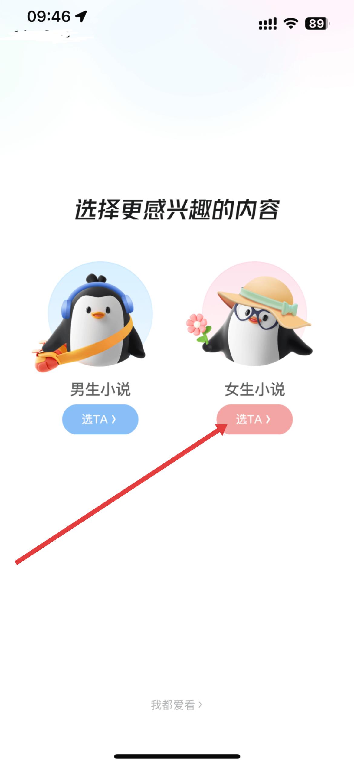 1、打開QQ閱讀,先看到內容選擇界面,可根據喜好選男生小說或女生小說,開啟閱讀之旅。