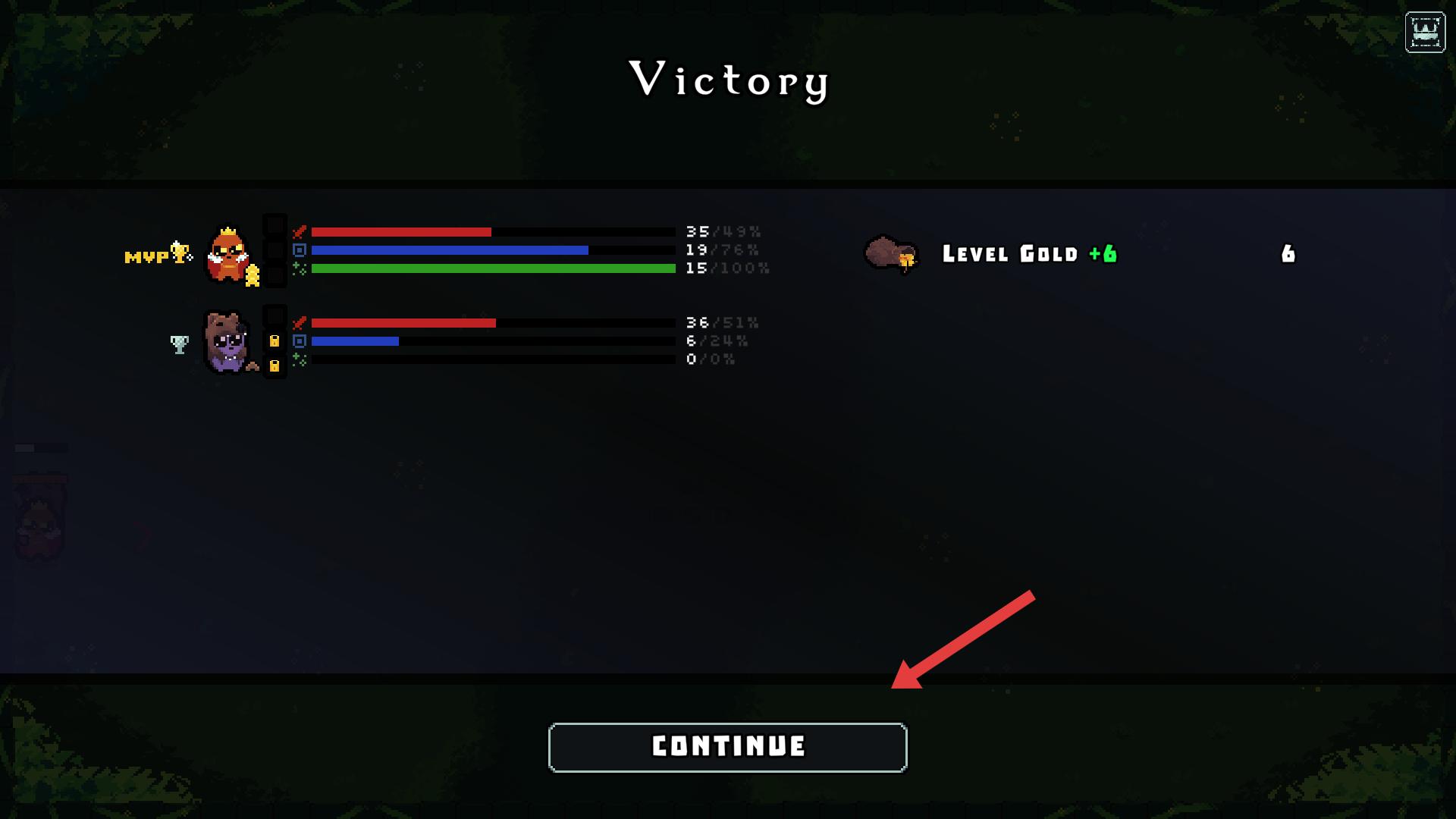 4、成功擊敗敵人后,會顯示勝利界面,此時點擊【CONTINUE】,可繼續游戲,前往下一個場景,開啟新的冒險與戰斗。