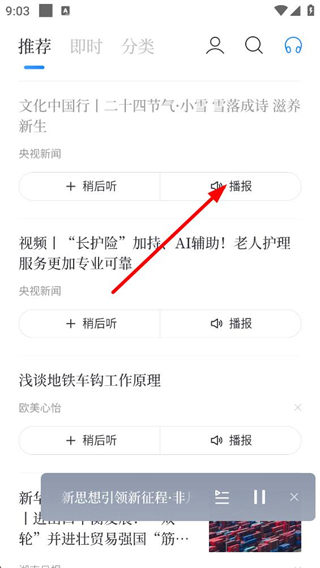 2、點擊音頻功能圖標后,資訊條目會出現稍后聽和播報按鈕,點擊播報可開啟音頻播放,下方會出現播放控制欄。