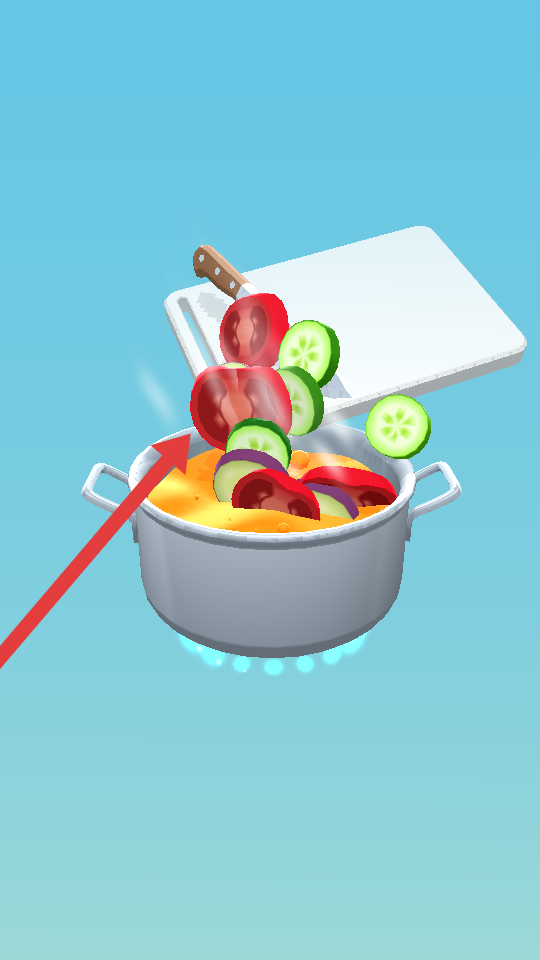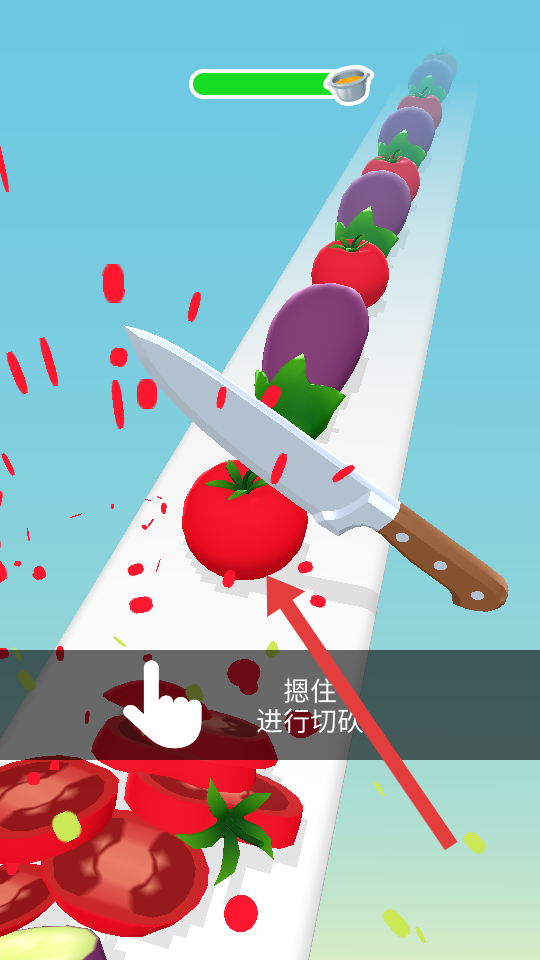1、進入游戲,看到排列的蔬菜,按住屏幕操控刀具,切割番茄等蔬菜,開始制作美食的第一步。