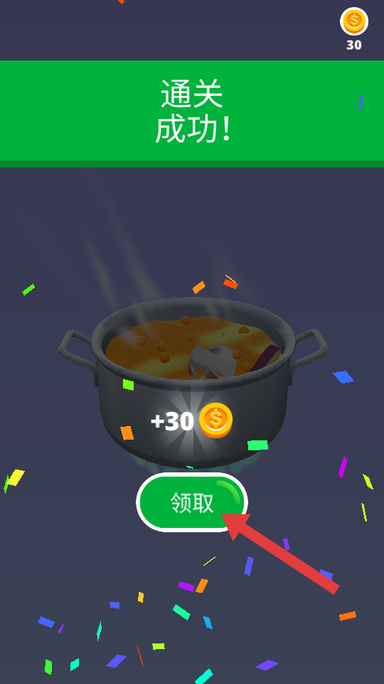 4、烹飪完成后,界面顯示通關成功,可領取金幣獎勵,然后繼續挑戰下一關,切割更多蔬菜制作美食。