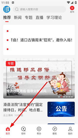 1、進入首頁,可看到推薦、新聞、專題等板塊,有各類資訊和專題內容,還可進行搜索和發布操作,方便用戶獲取本地信息。
