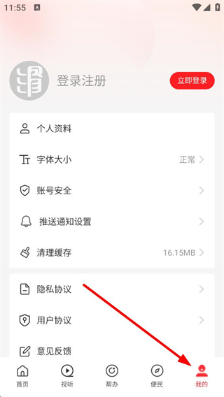 2、點擊我的,可進行登錄注冊,查看個人資料,調整字體大小,管理賬號安全,設置推送通知,清理緩存等,滿足用戶個性化設置和賬號管理需求。